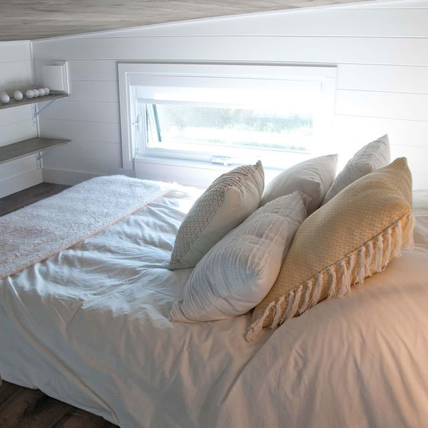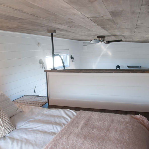 La chambre mezzanine est spacieuse et vient avec un matelas double entièrement naturel fait au Québec. On y accède par l’escalier de meunier avec rampe en acier noir. Une grande fenêtre permet de laisser entrer la lumière naturelle et un demi-muret procure une intimité tout en laissant une impression de grandeur et d'espace.